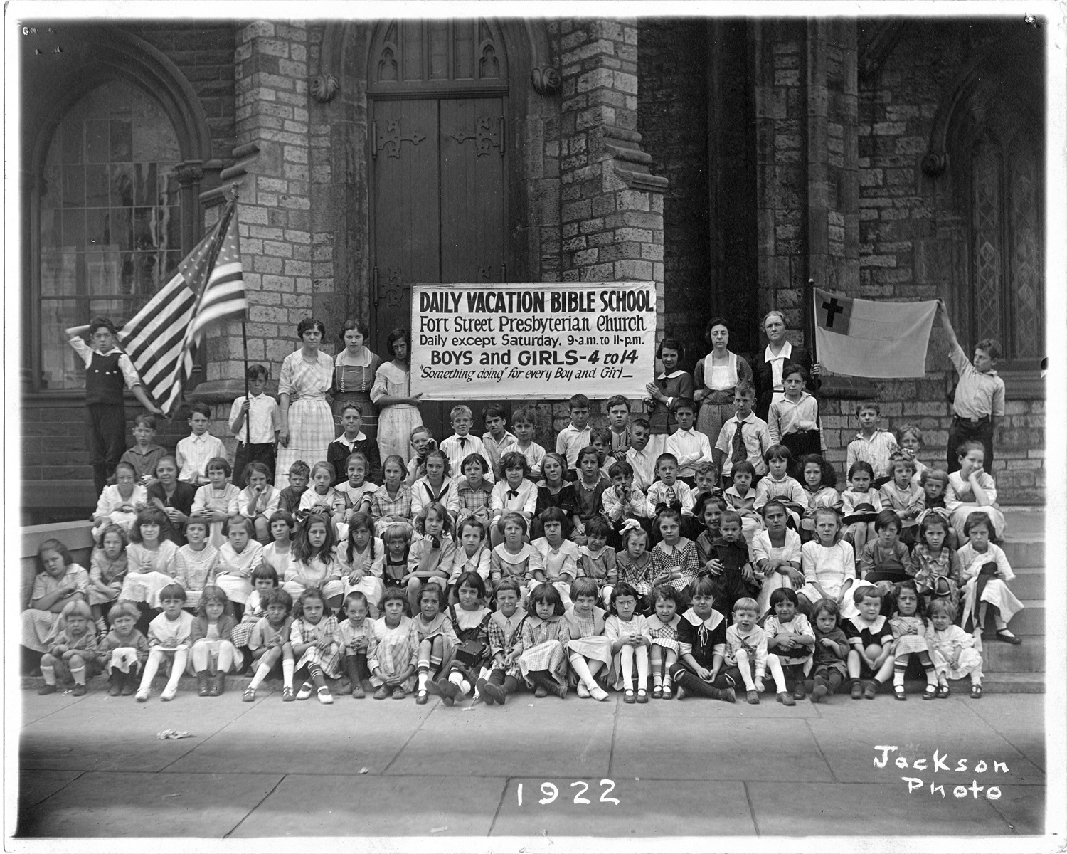 Students and teachers seated on the front steps of a church, some are standing in the back. Two young girls holding up sign that reads: "Daily Vacation Bible School Fort Street Presbyterian Church Daily except Saturday, 9 a.m. to 11 p.m. Boys and Girls - 4 to 14 "Something doing" for every Boy and Girl." Handwritten on front: "1922 Jackson Photo." Stamped on back: "Harvey C. Jackson, Photographer, Cherry 6054-M 2614 Beaubien St., Detroit, Mich."