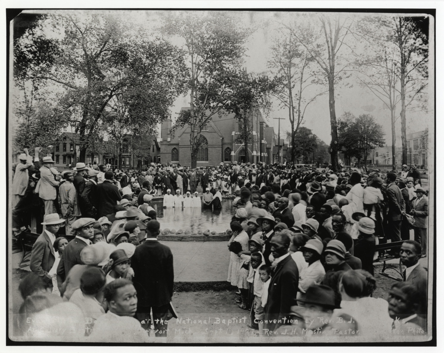 View of crowd of men, women and children gathered around circular pool as five people are baptized by a minister. Trees, houses, and the Calvary Baptist Church in the background. Handwritten on front: "[Evangelic Baptism] at the National Baptist Convention by Rev. B.J?.at Calvary Baptist Church Detroit, Mich. Sept. 11, 1927, Rev. J.H. Mastin, Pastor. Jackson Photo"