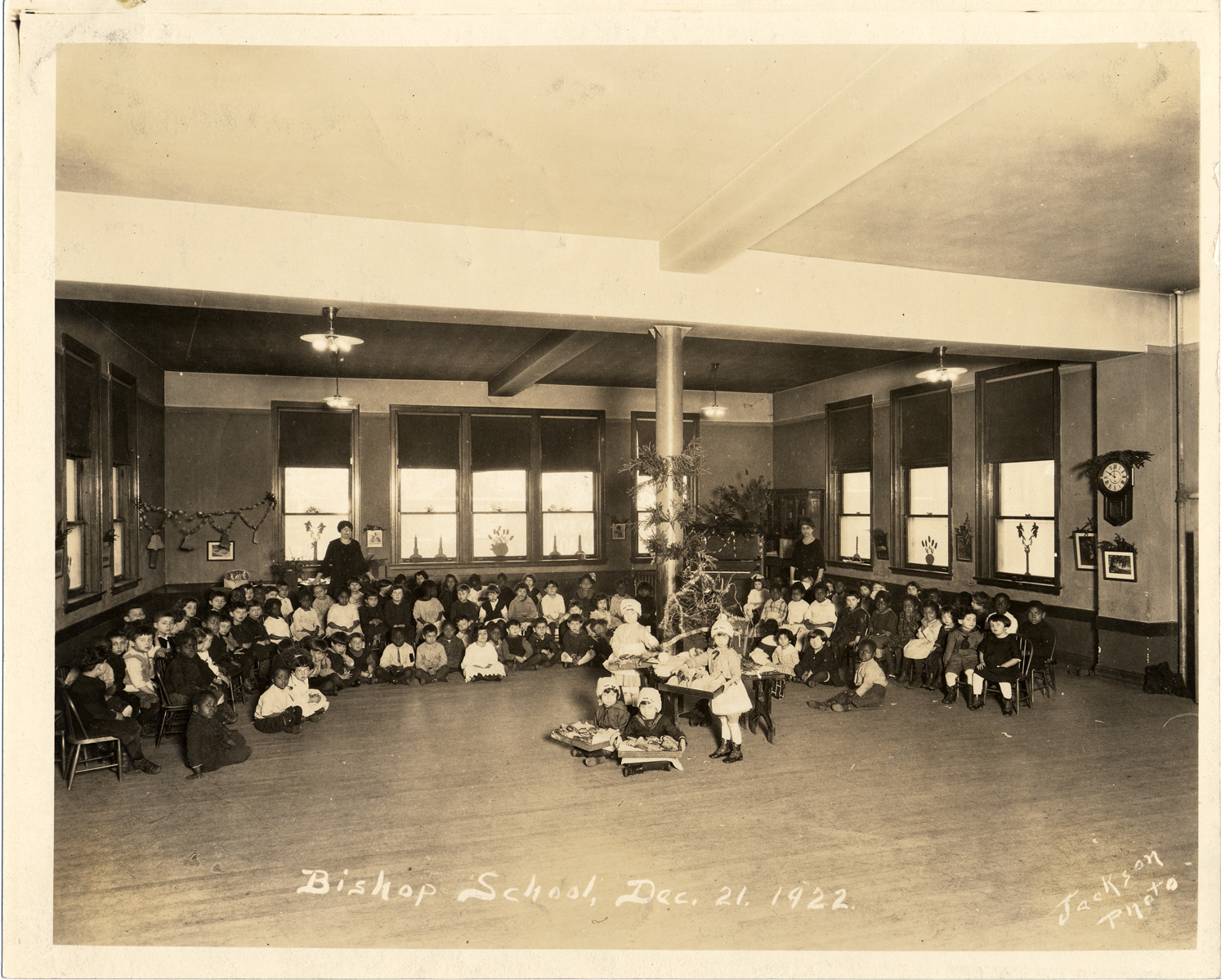 Children sitting in large classroom, holiday decoration on back wall, two female teachers in the rear of classroom, four little girls holding boxes of gifts near wooden pillar and small Christmas tree in center of room. Window shades on windows half drawn. Handwritten on front: "Kindergarten, Bishop School, Dec. 21, 1922, Jackson Photo."