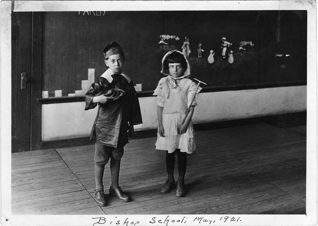 Boy and girl from Bishop School dressed in costumes, little girl is wearing a dress, bonnet, a slender scepter-like rod in her hand; the boy has a hat and a costume over his clothes, holding something in his right arm. Written on chalkboard: "TARDY." Paper cutouts of children playing are on the chalkboard. Room has wooden floor and door in the back. Handwritten on front: "Bishop School, May, 1921." Stamped on back: "Harvey C. Jackson, Photographer, Cherry 6054-M, 2614 Beaubien St. Detroit, Mich."