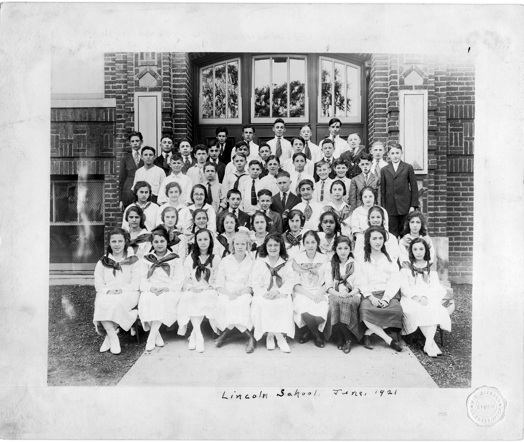 Students from Lincoln Schools in front of entrance to brick school building. Some are sitting down while the students toward the back are standing. Handwritten on front: "Lincoln School, June, 1921." Stamped on bottom right corner: "H.C. Jackson Studio, Detroit, Mich." Embossed on back: "Harvey C. Jackson, Photographer, Cherry 6054 M, 474 Beaubien St. Detroit, Mich."