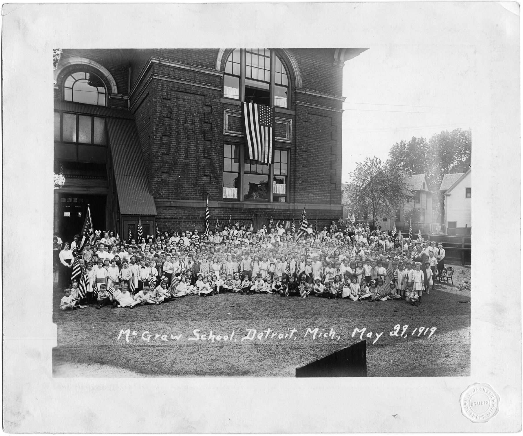 Large group of students on the front lawn of McGraw School in Detroit, some of the children are holding small American flags. Large brick school building in the back, large American flag hanging from one of the windows. Houses and trees visible in the right background. Handwritten on front: "McGraw School, Detroit, Mich., May 29, 1919." Embossed on bottom right corner: "H.C. Jackson Studio, Detroit, Mich." Stamped on back: "Harvey C. Jackson, Photographer, Cherry 6054 M, 474 Beaubien St. Detroit, Mich."