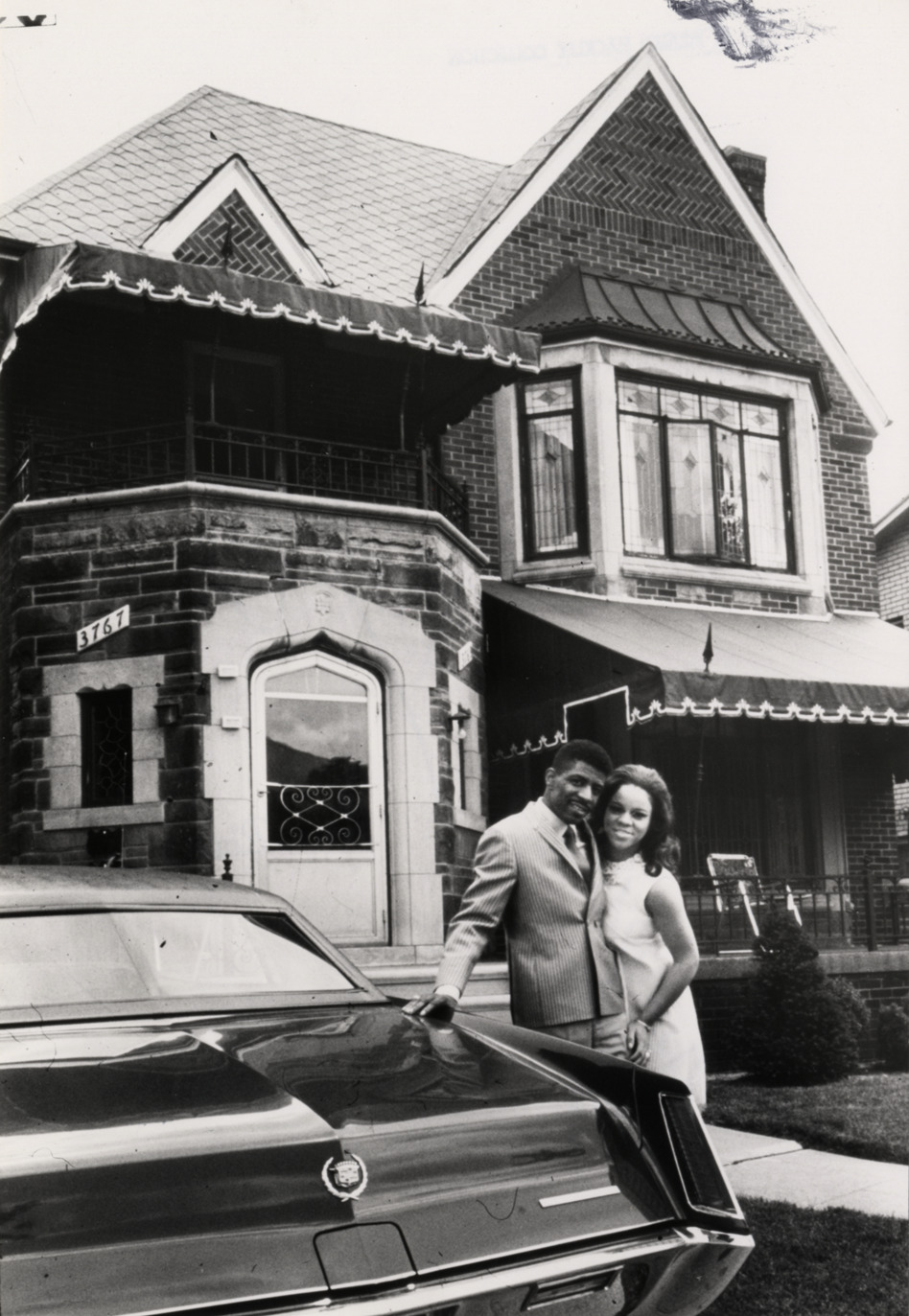 View of singer Florence Ballard and husband Thomas Chapman posing next to automobile in front of brick house. Handwritten on back: "Florence Ballard, singer."