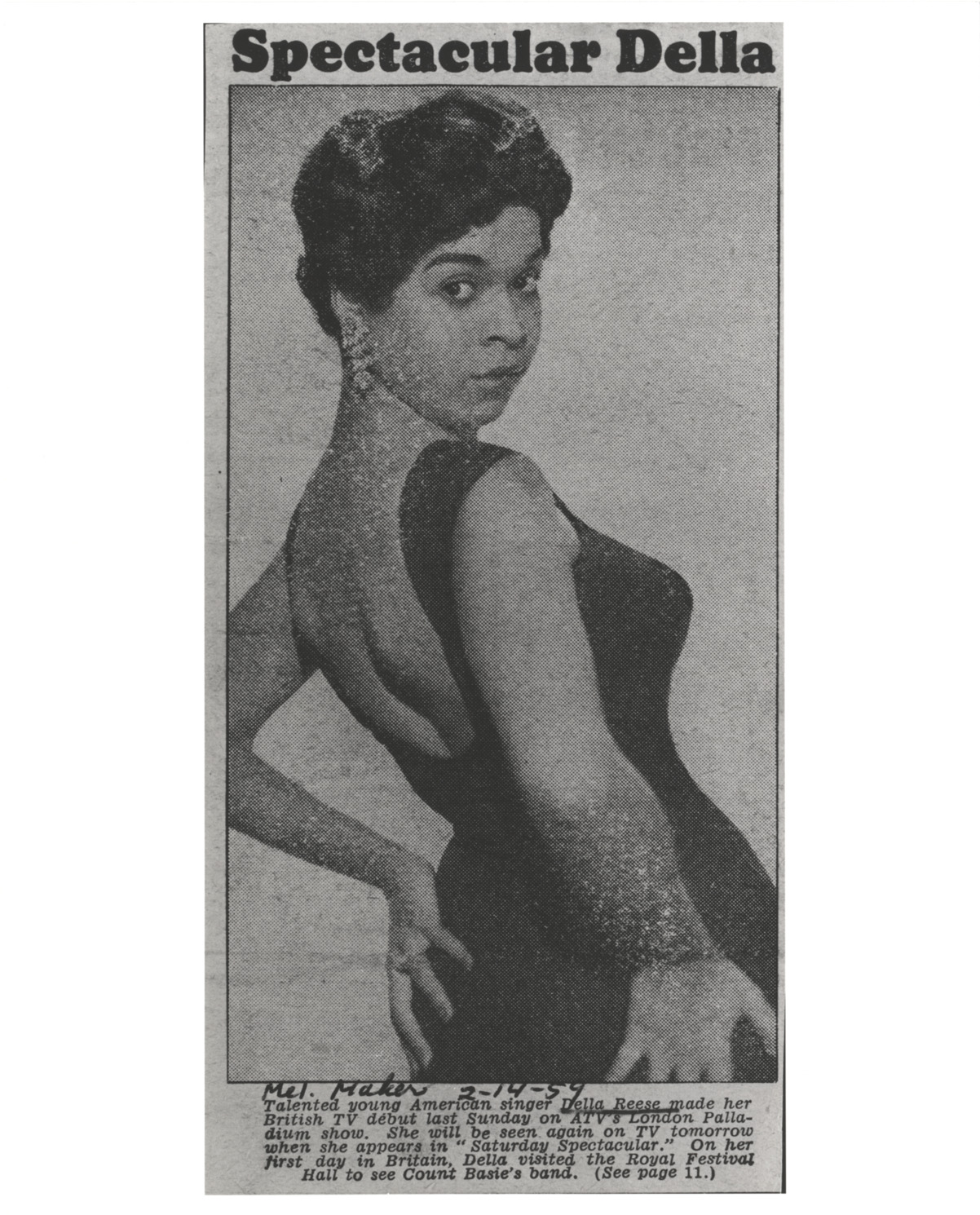 Portrait of Della Reese from article in Melody Maker newspaper. Printed on front: "Spectacular Della. Talented young American singer Della Reese made her British TV debut last Sunday on ATV's London Palladium show. She will be seen again on TV tomorrow when she appears in 'Saturday Spectacular.' On her first day in Britain, Della visited the Royal Festival Hall to see Count Basie's band. (See page 11.) Mel. Maker, 2-14-59."