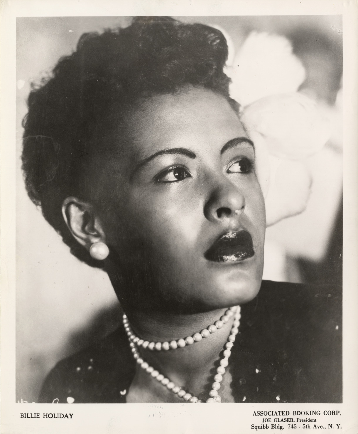 Favorite this☆ Billie Holiday Description: Portrait of singer Billie Holiday. Printed on front: "Billie Holiday. Associated Booking Corp. Joe Glaser, president. Squibb Bldg. 745, 5th Ave., N.Y." Details Resource ID: hk000019 Subject: Holiday, Billie, 1915-1959 African American women singers Photographic prints Date Issued: Unknown year Format: 1 photographic print ; 10 x 8.25 in. Member of: E. Azalia Hackley Collection Filing Location: Biography--Holiday, Billie Rights: Physical rights are retained by DPL. Copyright is retained in accordance with U.S. copyright laws.