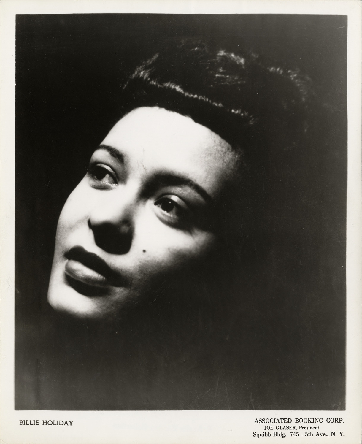 Favorite this☆ Billie Holiday Description: Portrait of singer Billie Holiday. Printed on front: "Billie Holiday. Associated Booking Corp. Joe Glaser, president. Squibb Bldg. 745, 5th Ave., N.Y." Details Resource ID: hk000021 Subject: Holiday, Billie, 1915-1959 African American women singers Photographic prints Date Issued: Unknown year Format: 1 photographic print ; 10 x 8 in. Member of: E. Azalia Hackley Collection Filing Location: Biography--Holiday, Billie Rights: Physical rights are retained by DPL. Copyright is retained in accordance with U.S. copyright laws.