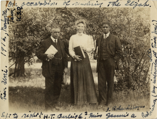 Portrait of tenor Roland Hayes, H.T. Burleigh and Jennie A. Robinson at Fisk University. Handwritten on front: "Fisk Uni., 1916, Nashville, Tenn., U.S.A., on occasion of reading the Elijah. Left to right: 1. H.T. Burleigh, 2. Miss Jennie A. Robinson (my instructor [undecipherable] at Fisk Uni.), 3. Roland Hayes."