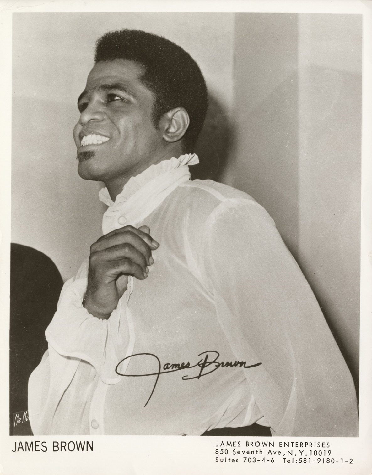 Favorite this☆ James Brown Description: Portrait of James Brown. Printed on front: "James Brown. James Brown Enterprises, 850 Seventh Ave., N.Y., 10019, Suites 703-4-6, Tel: 581-9180-1-2." Autograph on front: "James Brown." Details Resource ID: hk000063 Subject: Brown, James, 1933-2006 African American singers Photographic prints Date Issued: Unknown year Format: 1 photographic print ; 10.25 x 8 in. Member of: E. Azalia Hackley Collection Filing Location: Biography--Brown, James Rights: Physical rights are retained by DPL. Copyright is retained in accordance with U.S. copyright laws.