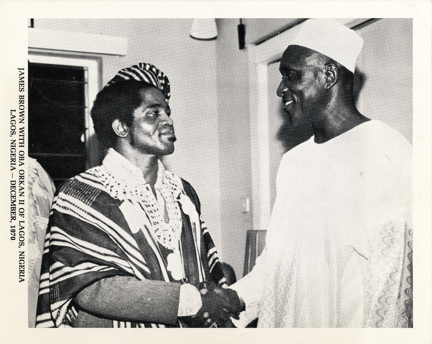 Favorite this☆ James Brown greeting Oba Orkan II Description: View of James Brown shaking hands with Oba Orkan II of Lagos, Nigeria. Printed on front: "James Brown with Oba Orkan II of Lagos, Nigeria. Lagos, Nigeria, December, 1970." Details Resource ID: hk000065 Subject: Brown, James, 1933-2006 African American singers Photographic prints Date Issued: 1970-12 Format: 1 photographic print ; 8 x 10 in. Member of: E. Azalia Hackley Collection Filing Location: Biography--Brown, James Rights: Physical rights are retained by DPL. Copyright is retained in accordance with U.S. copyright laws.