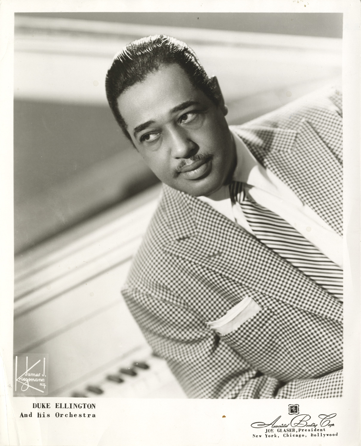 Favorite this☆ Duke Ellington Description: Portrait of Duke Ellington. Printed on front: "James J. Kriegsmann, N.Y. Duke Ellington and his orchestra. Associated Booking Corp. Joe Glaser, President. New York, Chicago, Hollywood." Details Resource ID: hk000068 Creator: Kriegsmann, James J. Subject: Ellington, Duke, 1899-1974 African American jazz musicians Photographers--New York (State)--New York Photographic prints Date Issued: Unknown year Format: 1 photographic print ; 10 x 8.25 in. Member of: E. Azalia Hackley Collection Filing Location: Biography--Ellington, Duke Rights: Physical rights are retained by DPL. Copyright is retained in accordance with U.S. copyright laws.