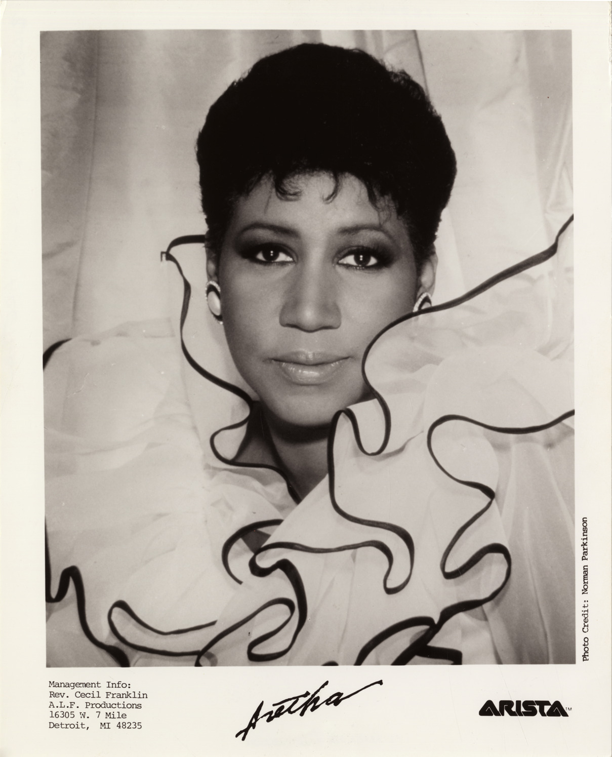 Favorite this☆ Aretha Franklin Description: Portrait of singer Aretha Franklin. Printed on front: "Management info: Rev. Cecil Franklin, A.L.F. Productions, 16305 W. 7 Mile, Detroit, MI 48235. Arista. Photo credit: Norman Parkinson." Facsmilie signature: "Aretha." Details Resource ID: hk000087 Creator: Parkinson, Norman, 1913-1990 Subject: Franklin, Aretha African American women singers Photographic prints Date Issued: Unknown year Format: 1 photographic print ; 10 x 8 in. Member of: E. Azalia Hackley Collection Filing Location: Biography--Franklin, Aretha Rights: Physical rights are retained by DPL. Copyright is retained in accordance with U.S. copyright laws.