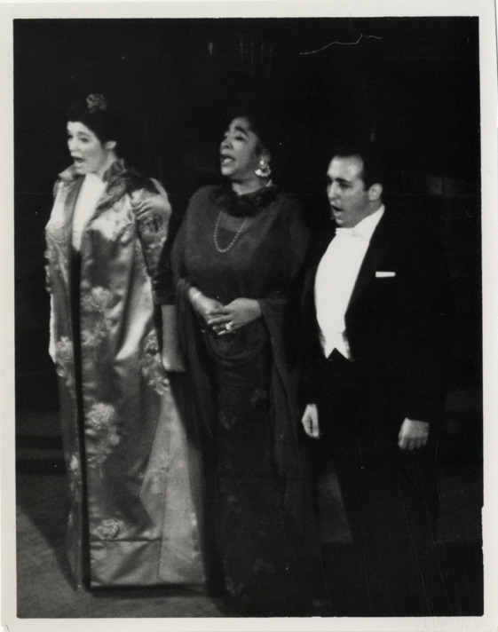 View of mezzo-soprano Betty Allen performing with two unidentified singers. Handwritten on back: "Allen, Betty."