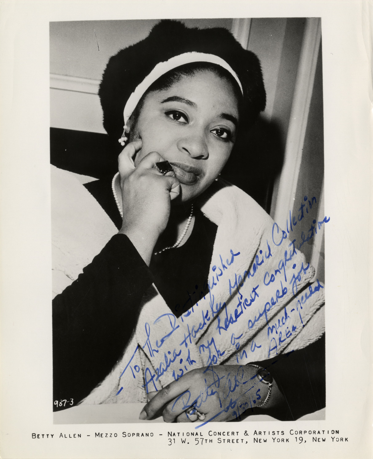 Portrait of mezzo-soprano Betty Allen. Autographed on front: "To the distinguished Azalia Hackley Memorial Collection with my heartiest congratulations for a superb job in a much needed area! Betty Allen 9/30/65." Printed on front: "Betty Allen, mezzo-soprano, National Concert & Artists Corporation, 31 W. 57th Street, New York 19, New York."
