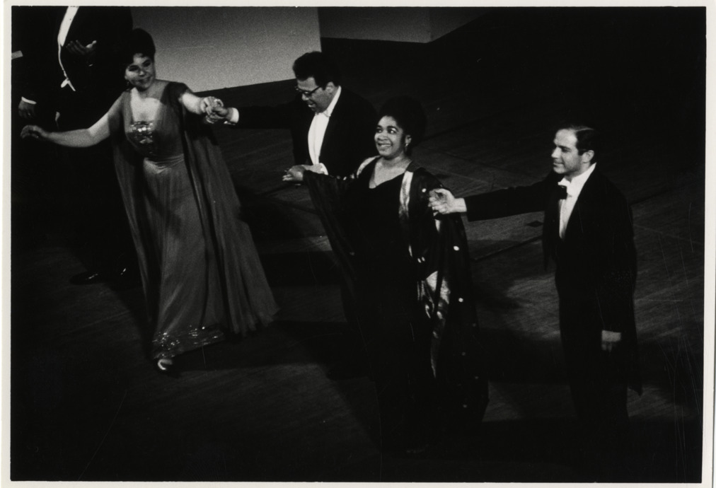 Favorite this☆ Betty Allen taking a bow onstage Description: View of mezzo-soprano Betty Allen taking a bow onstage with three unidentified singers. Stamped on back: "A Beth Bergman photograph." Handwritten on back: "Allen, Betty." Details Resource ID: hk000144 Creator: Bergman, Beth Subject: Allen, Betty, 1927-2009 African American women singers Photographic prints Date Issued: Unknown year Format: 1 photographic print ; 4.75 x 6.75 in. Member of: E. Azalia Hackley Collection Filing Location: Biography--Allen, Betty Rights: Physical rights are retained by DPL. Copyright is retained in accordance with U.S. copyright laws.