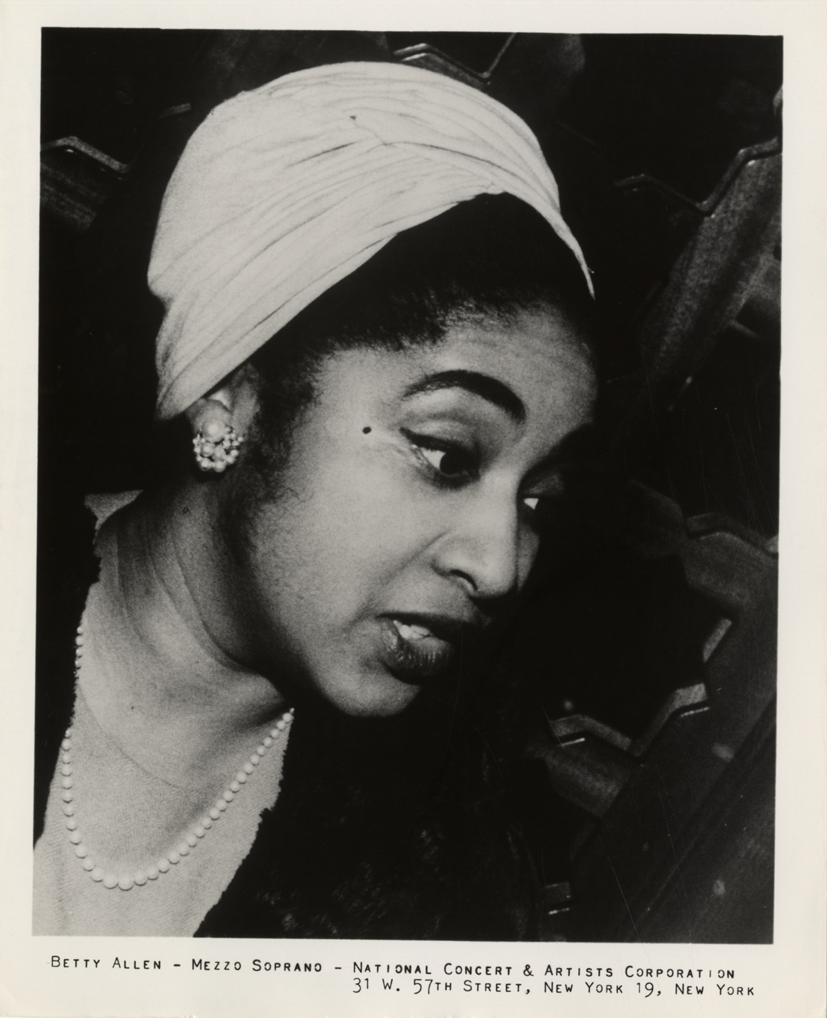 Portrait of mezzo-soprano Betty Allen. Printed on front: "Betty Allen, mezzo-soprano. National Concert & Artists Corporation, 31 West 57th Street, New York 19, N.Y." Handwritten on back: "Allen, Betty."