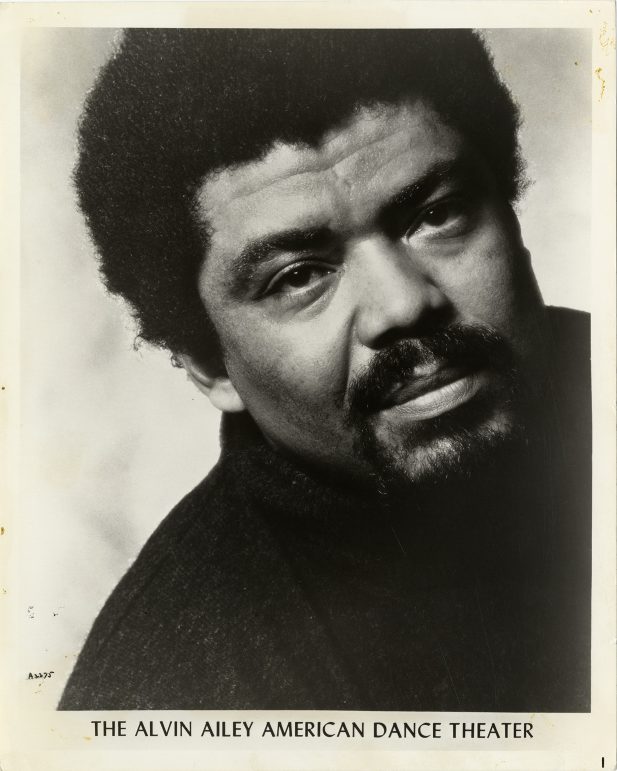 Favorite this☆ Alvin Ailey Description: Portrait of dancer and choreographer Alvin Ailey. Printed on front: "The Alvin Ailey American Dance Theater." Typed on back: "Alvin Ailey City Center Dance Theater, A2275, Alvin Ailey." Handwritten on back: "Ailey, Alvin, dancer." Details Resource ID: hk000155 Subject: Ailey, Alvin African American dancers Choreographers Photographic prints Date Issued: Unknown year Format: 1 photographic print ; 10 x 8 in. Member of: E. Azalia Hackley Collection Filing Location: Biography--Ailey, Alvin Rights: Physical rights are retained by DPL. Copyright is retained in accordance with U.S. copyright laws.