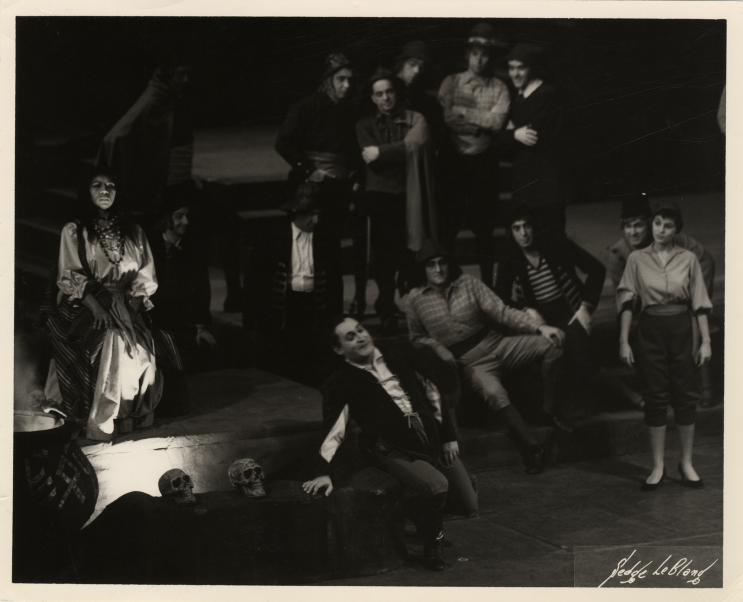 Marian Anderson and cast members in a scene from Verdi's "Un ballo in maschera." Printed on front: "Sedge LeBlang." Stamped on back: "Sedge LeBlang, photographer for the Metropolitan Opera, 147 West 39th St., N.Y. 18, N.Y. PE. 6-8640." Handwritten on back: "Ballo in maschera, Act I, sc. 2. Ulrica's den (Metropolitan Opera). (l to r) Marian Anderson (Ulrica), Richard Tucker (Riccardo), Roberta Peters (Oscar)."