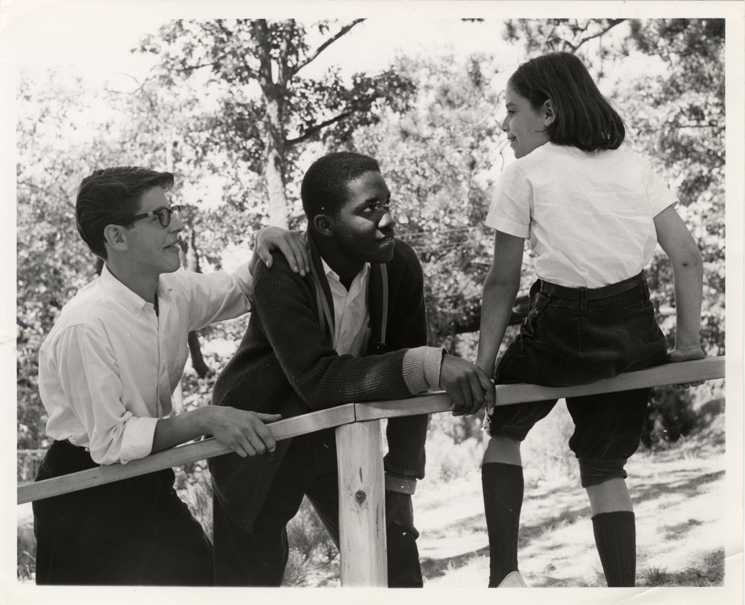 View of violinist Darwyn Apple with two students at the National Music Camp in Interlochen, Michigan. Typed on back: "Darwyn Apple at National Music Camp, Interlochen, Michigan, Summer, 1961."