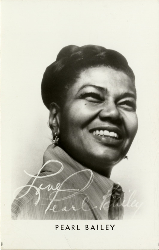 Favorite this☆ Pearl Bailey Description: Portrait of singer and actress Pearl Bailey. Printed on front: "Pearl Bailey." "Love, Pearl Bailey" autograph is printed on front. Details Resource ID: hk000236 Subject: Bailey, Pearl Bailey, Pearl--Autographs African American women singers African American actresses Photographic prints Date Issued: Unknown year Format: 1 photographic print ; 5.5 x 3.5 in. Member of: E. Azalia Hackley Collection Filing Location: Biography--Bailey, Pearl Rights: Physical rights are retained by DPL. Copyright is retained in accordance with U.S. copyright laws.