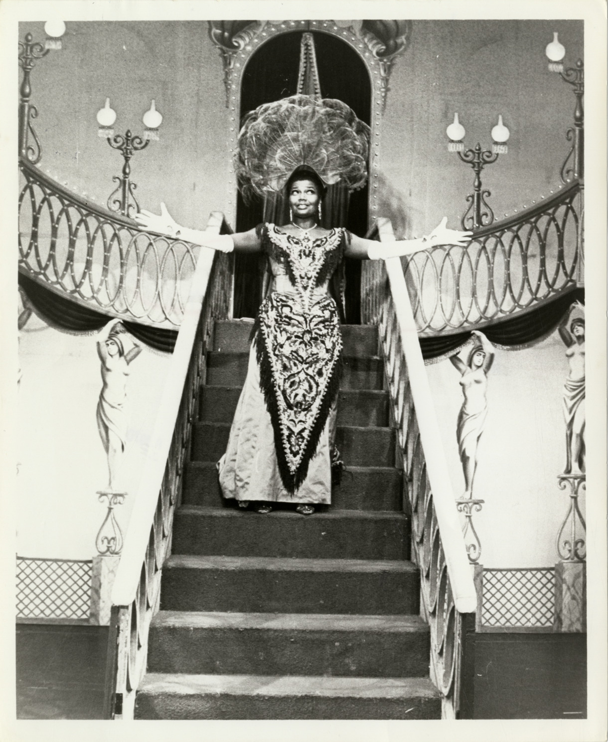 View of singer and actress Pearl Bailey in a scene from the musical "Hello, Dolly!" Bailey stands on staircase. Stamped on back: "Direct from Broadway, David Merrick presents America's greatest musical. Pearl Bailey in Hello, Dolly! Co-starring Cab Calloway. Directed and choreographed by Gower Champion." Handwritten on back: "Pearl Bailey."