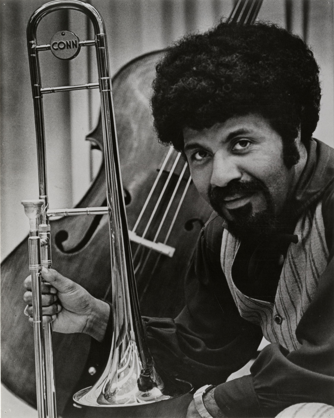 Favorite this☆ David Baker Description: Portrait of musician and composer David Baker, holding trombone. Cello in background. Typed on back: "David Baker." Details Resource ID: hk000249 Subject: Baker, David, 1931- African American musicians African American composers Trombonists Trombone Cello Photographic prints Date Issued: Unknown year Format: 1 photographic print ; 9.5 x 7.5 in. Member of: E. Azalia Hackley Collection Filing Location: Biography--Baker, David Rights: Physical rights are retained by DPL. Copyright is retained in accordance with U.S. copyright laws.