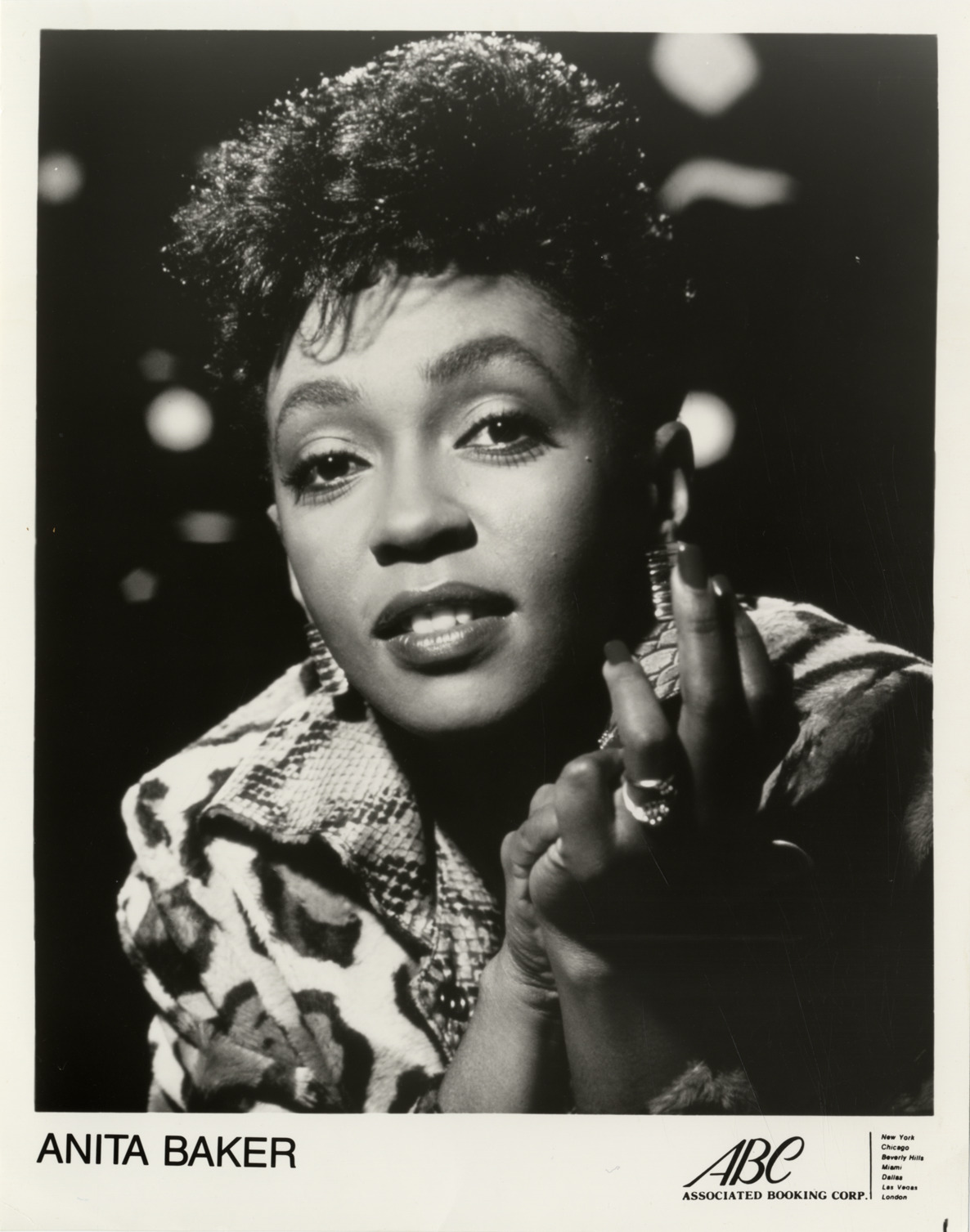 Favorite this☆ Anita Baker Description: Portrait of singer Anita Baker. Printed on front: "Anita Baker. ABC Associated Booking Corp., New York, Chicago, Beverly Hills, Miami, Dallas, Las Vegas, London." Details Resource ID: hk000269 Subject: Baker, Anita African American women singers Photographic prints Date Issued: Unknown year Format: 1 photographic print ; 10 x 8 in. Member of: E. Azalia Hackley Collection Filing Location: Biography--Baker, Anita Rights: Physical rights are retained by DPL. Copyright is retained in accordance with U.S. copyright laws.