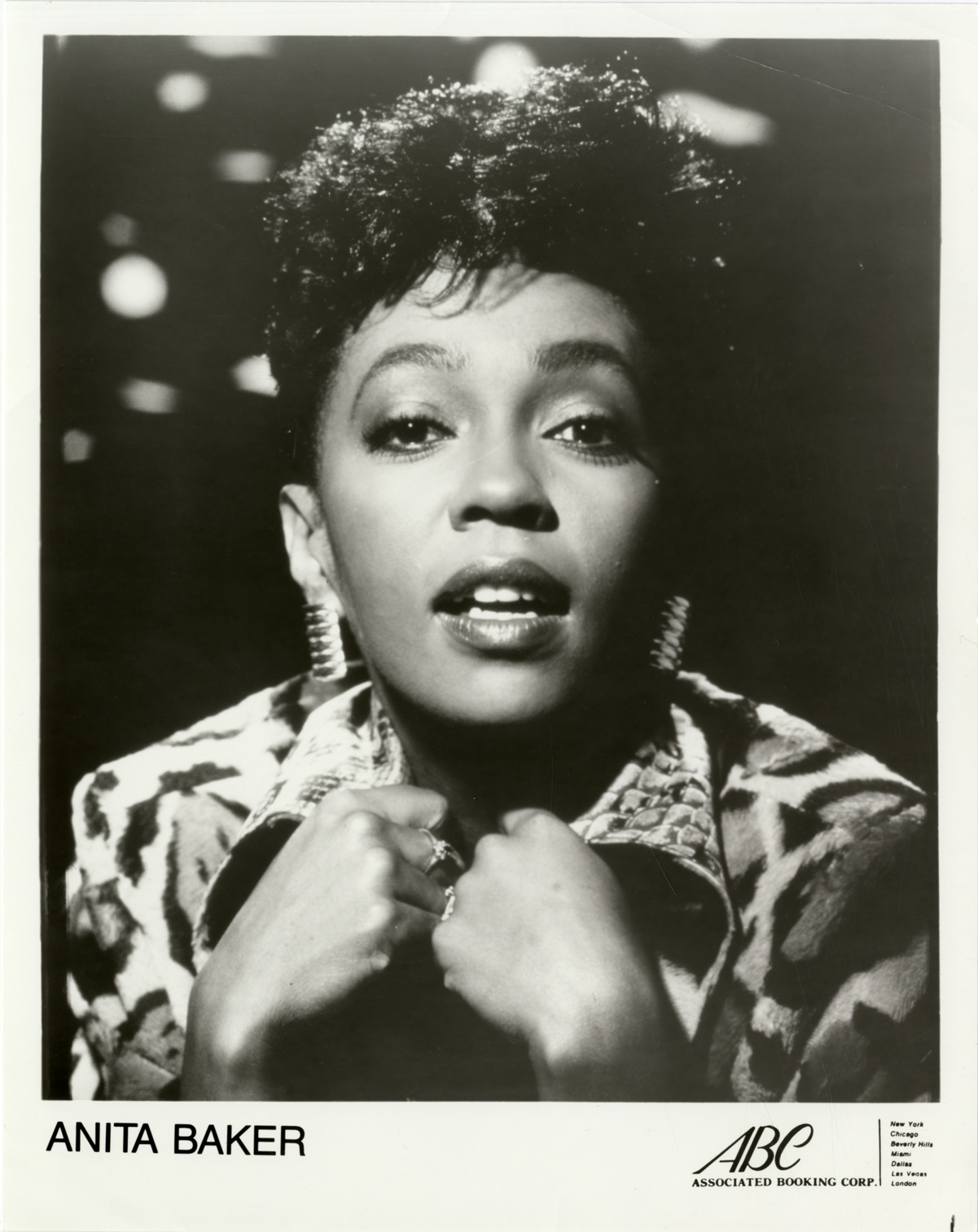 Favorite this☆ Anita Baker Description: Portrait of singer Anita Baker. Printed on front: "Anita Baker. ABC Associated Booking Corp., New York, Chicago, Beverly Hills, Miami, Dallas, Las Vegas, London." Details Resource ID: hk000270 Subject: Baker, Anita African American women singers Photographic prints Date Issued: Unknown year Format: 1 photographic print ; 10 x 8 in. Member of: E. Azalia Hackley Collection Filing Location: Biography--Baker, Anita Rights: Physical rights are retained by DPL. Copyright is retained in accordance with U.S. copyright laws.