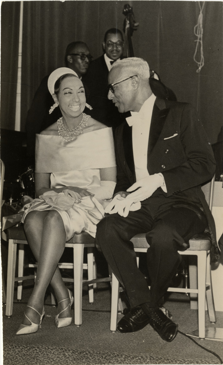View of singer Josephine Baker and Harold Jackman at the Beaux Arts Ball, Hotel Roosevelt in New York, New York. Stamped on back: "Photo by Cecil Layne." Handwritten on back: "Josephine Baker and Harold Jackman at the Beaux Arts Ball, Hotel Roosevelt, New York City, Feb. 12, 1960."