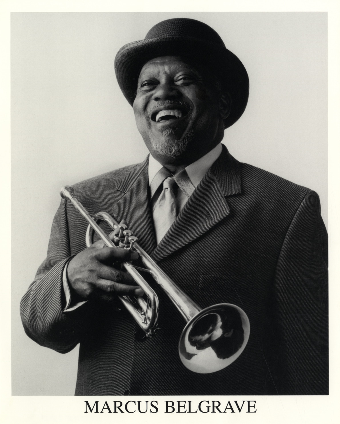 Portrait of Marcus Belgrave, holding a trumpet. Printed on front: "Marcus Belgrave."