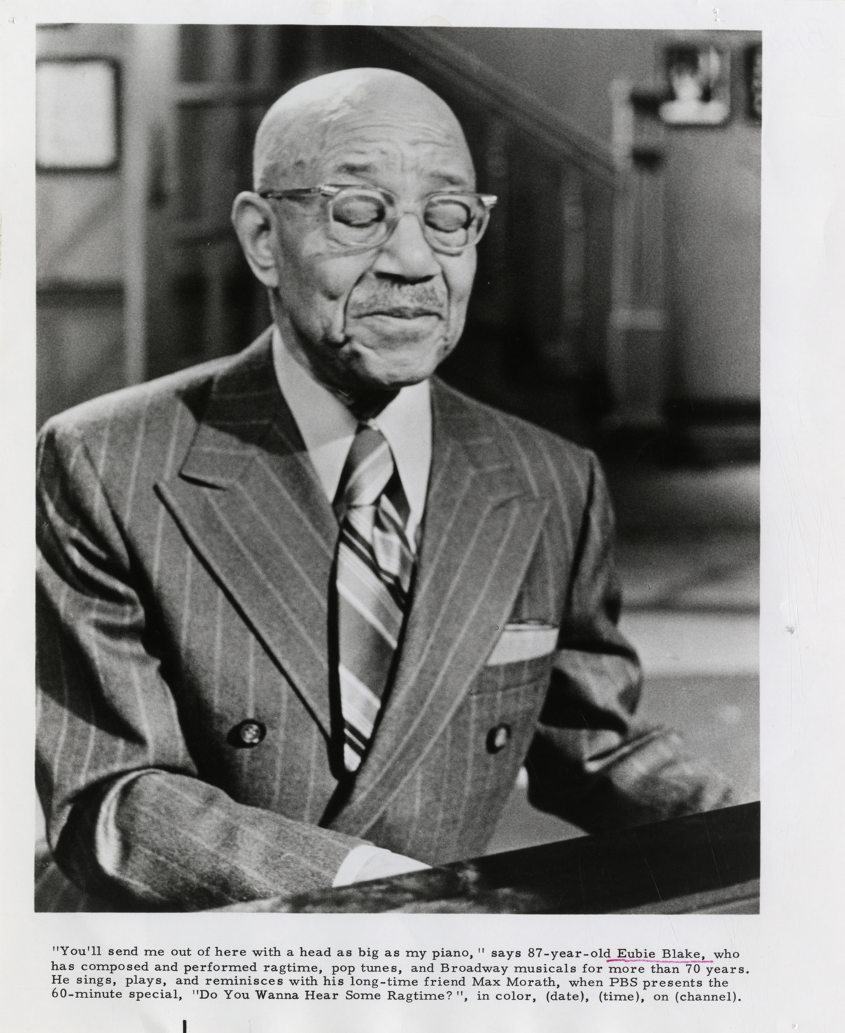 View of Eubie Blake playing the piano. Printed on front: "'You'll send me out of here with a head as big as my piano,' says 87-year-old Eubie Blake, who has composed and performed ragtime, pop tunes, and Broadway musicals for more than 70 years. He sings, plays, and reminisces with his long-time friend Max Morath, when PBS presents the 60-minute special, 'Do you wanna hear some ragtime?' in color, (date), (time), on (channel)."