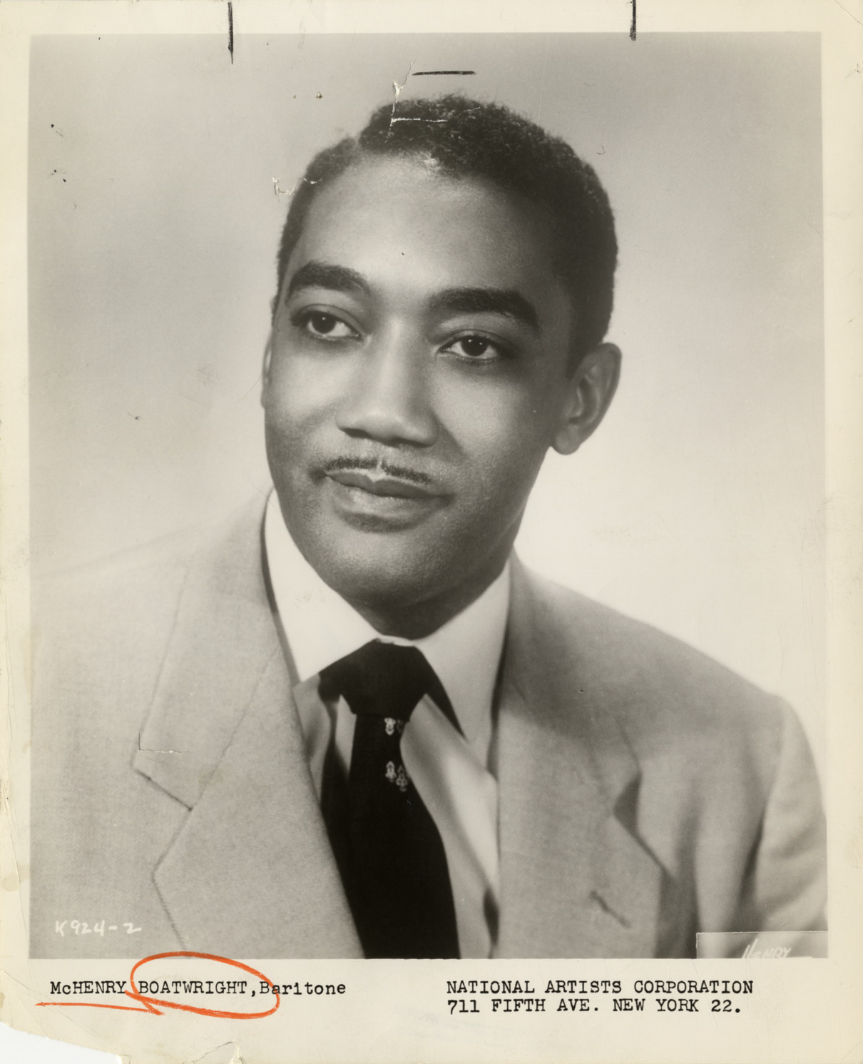 Favorite this☆ McHenry Boatwright Description: Portrait of baritone McHenry Boatwright. Printed on front: "McHenry Boatwright, baritone. National Concert & Artist Corporation, 711 Fifth Ave., New York, 22, N.Y. Henry, photo." Details Resource ID: hk000328 Creator: Henry Subject: Boatwright, McHenry, 1928-1994 African American singers Photographic prints Date Issued: Unknown year Format: 1 photographic print ; 10 x 8 in. Member of: E. Azalia Hackley Collection Filing Location: Biography--Boatwright, McHenry Rights: Physical rights are retained by DPL. Copyright is retained in accordance with U.S. copyright laws.