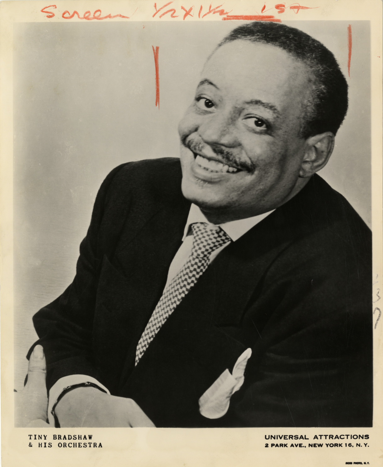 Portrait of musician and bandleader Tiny Bradshaw. Printed on front: "Tiny Bradshaw & his orchestra. Universal Attractions, 2 Park Ave., New York 16, N.Y. Moss Photo, N.Y." Typed on back: "Sax star Tiny Bradshaw, Crystal Show Bar."