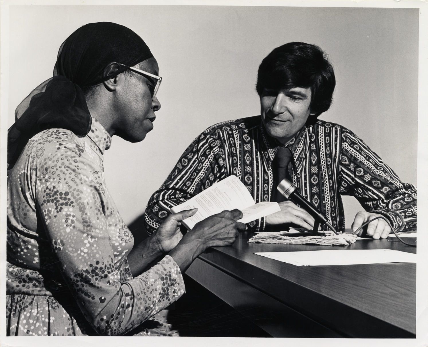 View of poet Gwendolyn Brooks reading from book into microphone. Unidentified man is seated across table.
