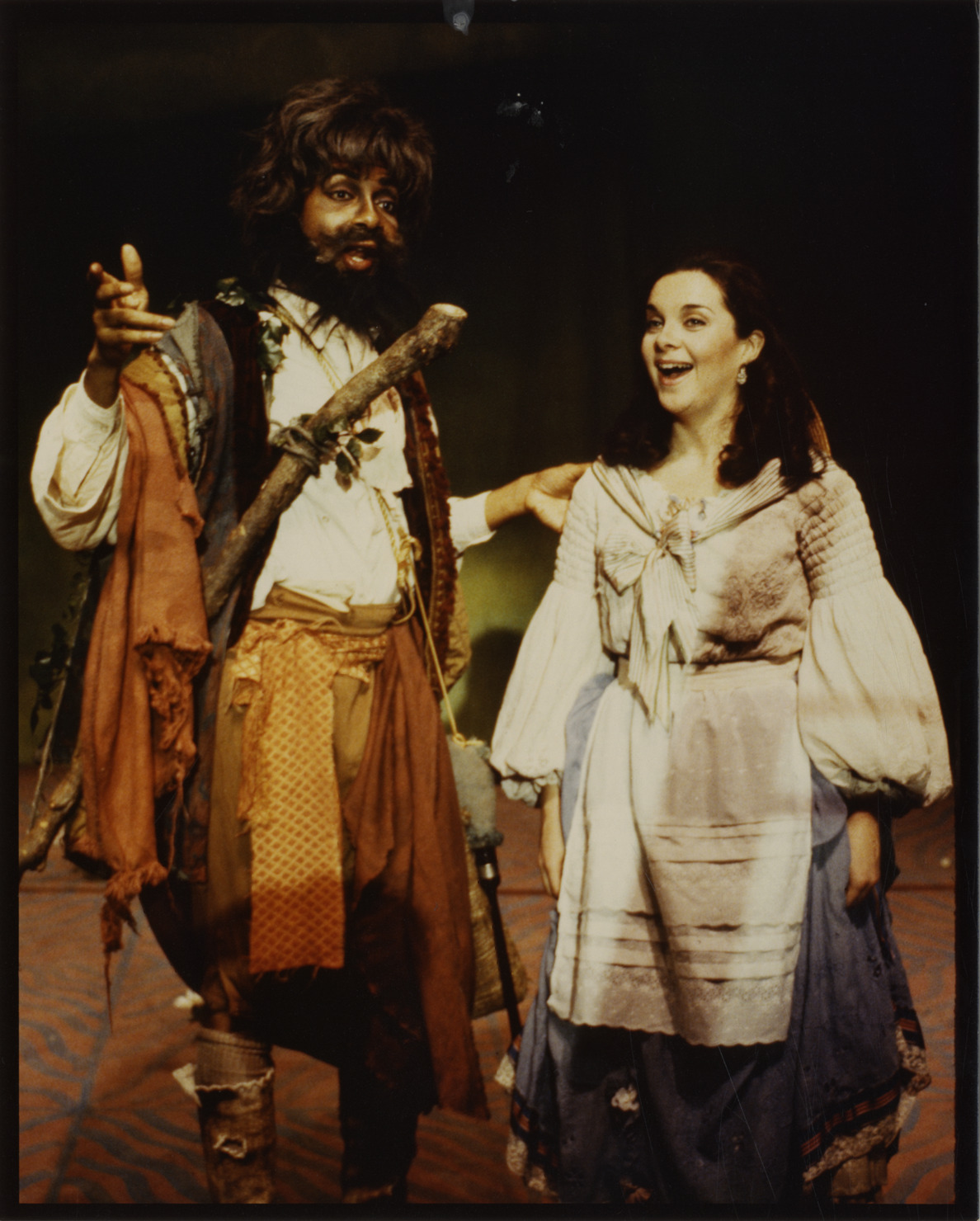 View of bass-baritone Charles Samuel Brown performing with cast member as Colas in Mozart's opera "Bastien and Bastienne." Label on back: "Bastien and Bastienne, W.A. Mozart. The Opera Ensemble of New York. Charles Samuel Brown as Colas."