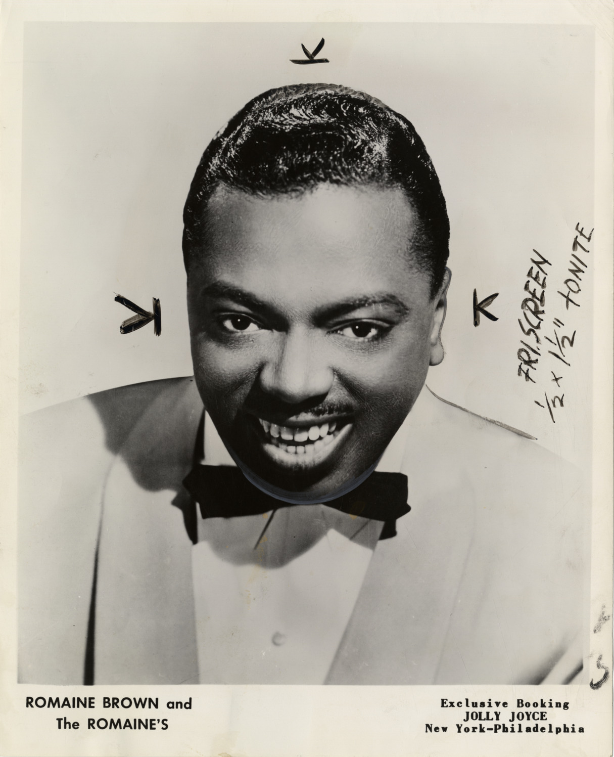 Portrait of singer Romaine Brown. Printed on front: "Romaine Brown and the Romaine's. Exclusive booking, Jolly Joyce, New York, Philadelphia." Handwritten on back: "Romaine Brown and his sensational vocal and instrumental group."