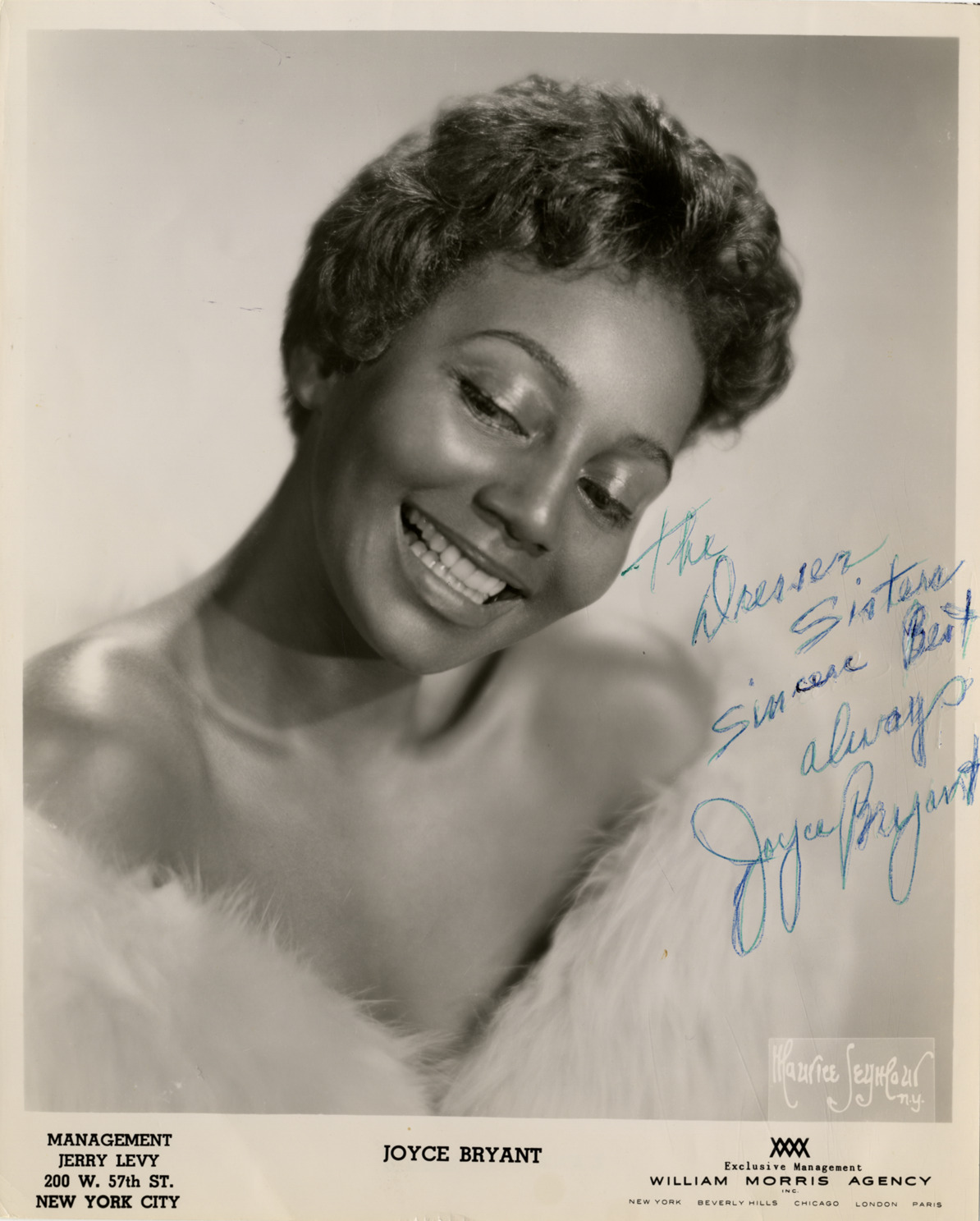 Portrait of singer Joyce Bryant. Autographed on front: "The Dresser Sisters, sincere best always, Joyce Bryant." Printed on front: "Joyce Bryant. Management, Jerry Levy, 200 W. 57th St., New York City. Exclusive management, William Morris Agency, Inc., New York, Beverly Hills, Chicago, London, Paris. Maurice Seymour, N.Y." Handwritten on back: "Joyce Bryant, 126 W. 23rd St., New York, N.Y."