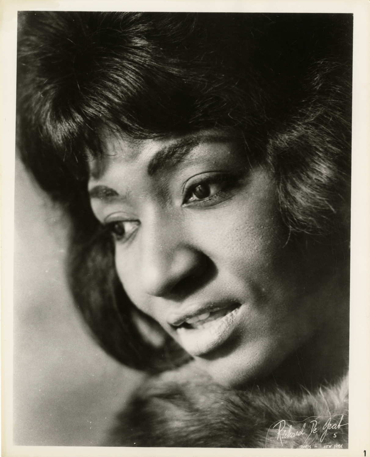 Portrait of mezzo-soprano Grace Bumbry. Printed on front: "Richard De Grab, Paris, New York." Stamped on back: "S. Hurok presents Grace Bumbry, mezzo-soprano. Hurok Attractions, 730 Fifth Avenue, N.Y. 19, N.Y. Martin Feinstein, publicity director; Michael Sweeley, associate. Phone: Circle 5-0500."