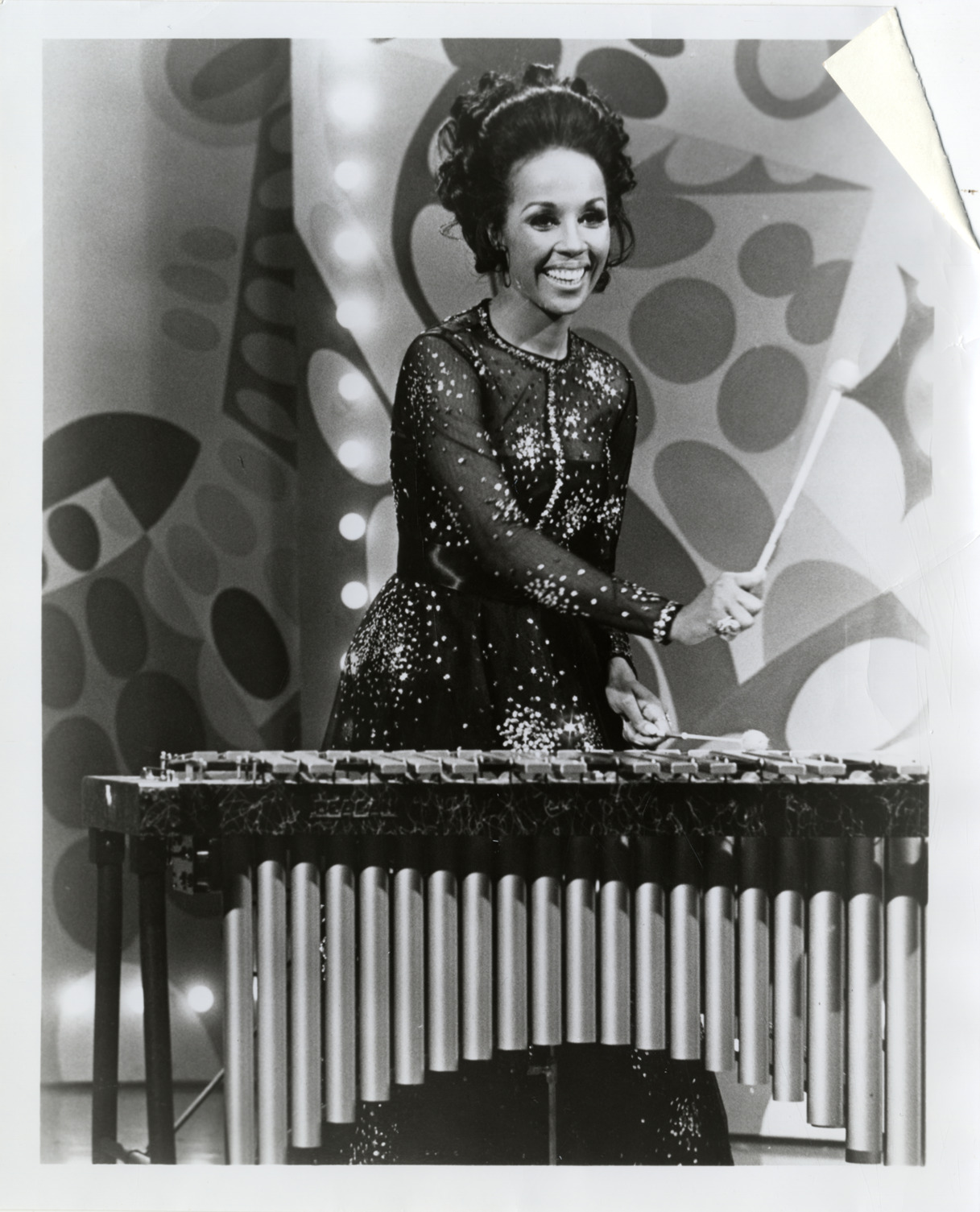 View of singer and actress Diahann Carroll playing vibraphone on the television special "Movin.'" Label on back: "Movin', Tuesday, February 24, 1970, 7:30 - 8:30 PM, PST, CBS-TV. Exclusive in your city. Diahann Carroll takes over on the vibes by way of an introduction to her guest star assignment on CBS-TV's super-special, Movin', which assembles an impressive line-up of top record world personalities. Joining Miss Carroll for the variety show will be special guest star Andy Williams plus such celebrities as Burt Bacharach, Roy Clark, Jose Feliciano, Lorne Greene, Liza Minnelli, Gaylord & Holiday, Bill Medley and the Movin' Singers and Dancers."