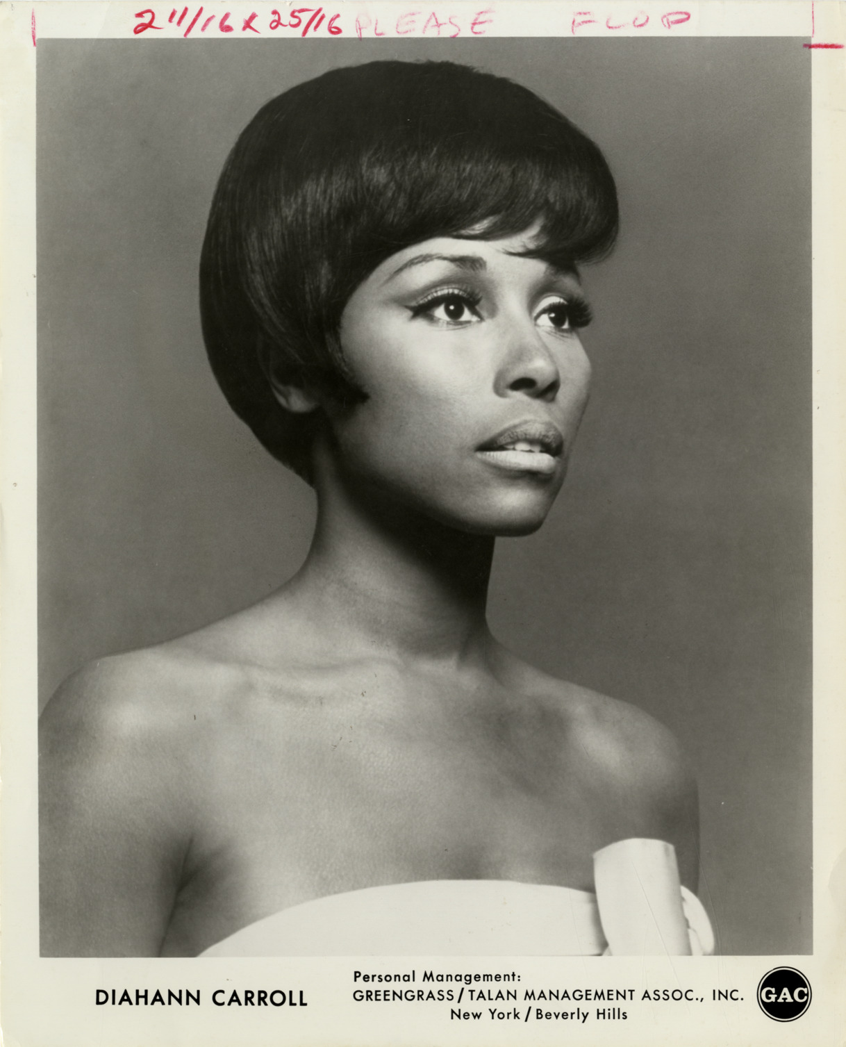 Portrait of singer and actress Diahann Carroll. Printed on front: "Diahann Carroll. Personal management, Greengrass/Talan Management Assoc., Inc., New York, Beverly Hills. GAC." Clipping on back: "Diahann Carroll at the Elmwood." Label on back: "ABC Photo Division, press information. ABC Television Network, 7 West 66th Street, New York 23, N.Y. Exclusive to you in your city. Palace guest. Broadway, recording and TV song star Diahann Carroll guests along with comedy duo Allen and Rossi and host Nat King Cole on ABC-TV's 'The Hollywood palace' Saturday, March 21 (9:30-10:30 p.m., EST)."