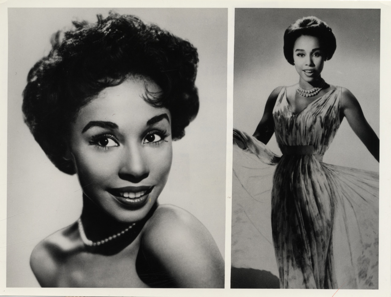 Two portraits of singer and actress Diahann Carroll. Stamped on back: "CBC photograph copy by Henry Fox, FRPS, photographic illustrator, 334-338 Adelaide St. W, Toronto, EM. 6-2325." Label on back: "CBC Picture Service. Diahann Carroll on 'Parade,' 'Tea zone.' Diahann Carroll, star of the Broadway show 'No strings,' will be seen three times on the CBC-TV network, Wednesday, Thursday, and Friday, Aug. 15, 16 and 17. She will be seen once in song, as star vocalist on 'Parade,' Wednesday, Aug. 15, and twice in conversation with host Larry Mann on 'Tea zone' on the Thursday and Friday. Joining Miss Carroll on 'Tea zone' will be Richard Rodgers, Compser and lyricist of 'No strings.' Information Services, Canadian Broadcasting Corporation. Diahann Carroll, July, 1962."