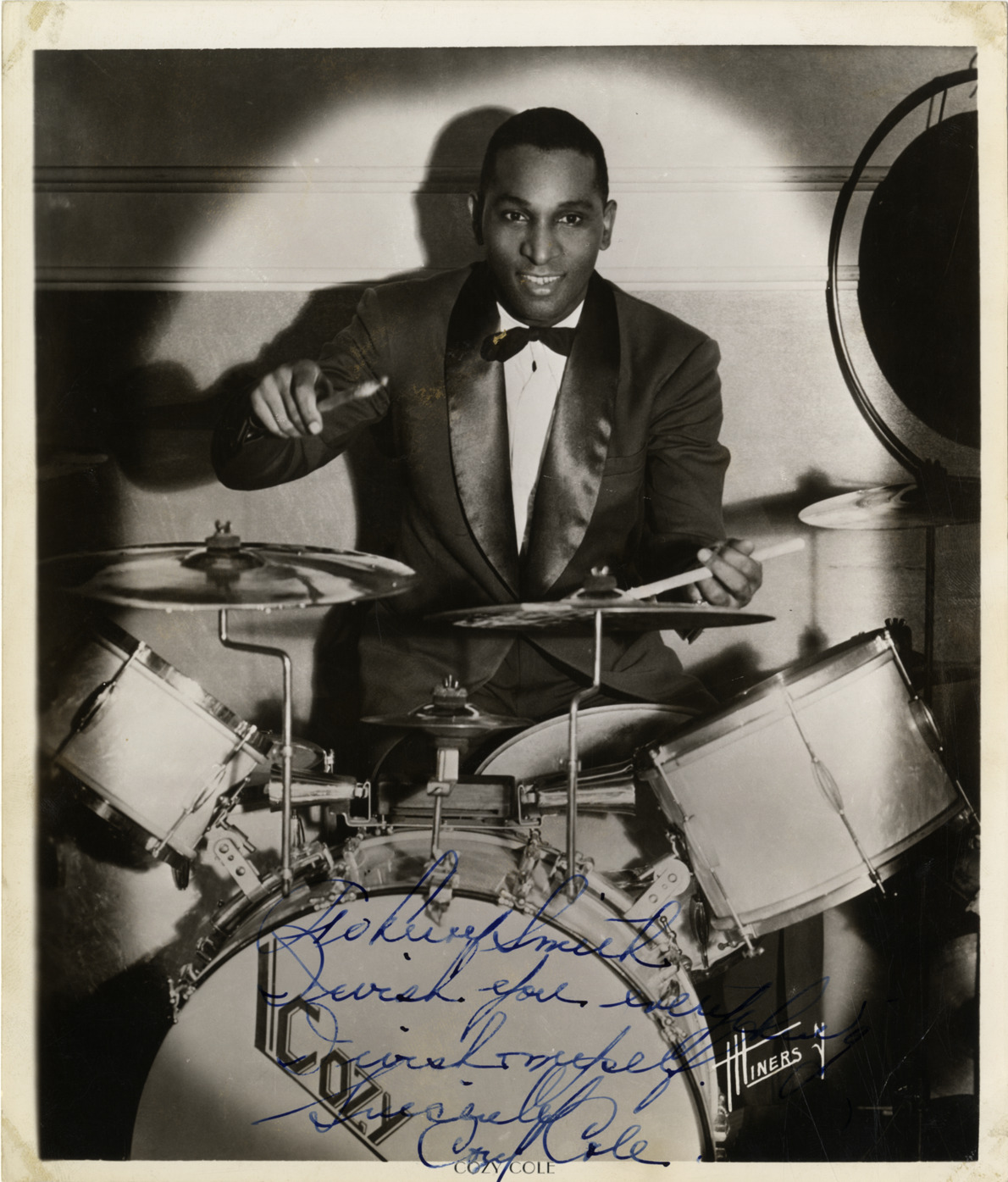 Favorite this☆ Cozy Cole Description: Portrait of jazz musician Cozy Cole playing the drums. Autographed on front: "To Leroy Smith, I wish you everything I wish myself. Sincerely, Cozy Cole." Printed on front: "Cozy Cole, Miners." Details Resource ID: hk000521 Creator: Miners Subject: Cole, Cozy Cole, Cozy--Autographs African American jazz musicians Drummers (Musicians) Drum set Photographic prints Date Issued: Unknown year Format: 1 photographic print ; 9.5 x 8 in. Member of: E. Azalia Hackley Collection Filing Location: Biography--Cole, Cozy Rights: Physical rights are retained by DPL. Copyright is retained in accordance with U.S. copyright laws.