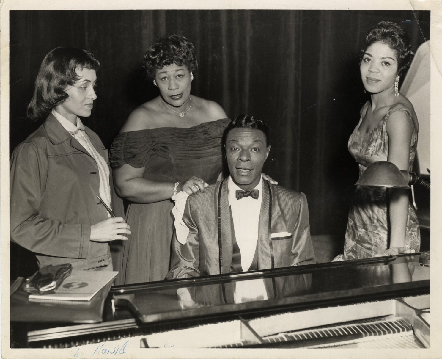 View of singer Nat King Cole sitting at piano and surrounded by Ella Fitzgerald, his wife Maria Cole, and Frances Burnett. Handwritten on back: "Cole, Nat. Fitzgerald, Ella. Burnett, Frances (?) on Cole's left; Maria (Mrs. Nat) on Cole's far right?"
