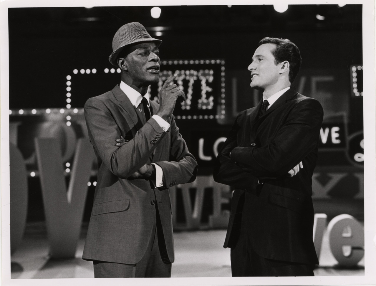 View of singer Nat King Cole and singer Larry Kert on "The Nat King Cole show." Label on back: "Nat King Cole and Larry Kert on CKLW-TV special. A 60-minute variety special, 'The Nat King Cole show,' will be presented Tuesday, November 7 on CKLW-TV from 8 to 9 p.m. Larry Kert (right), who was star of Broadway's "West side story,' is Nat King Cole's guest. Produced in Toronto, the show takes Cole's recent album, 'Wild is love,' as its theme."