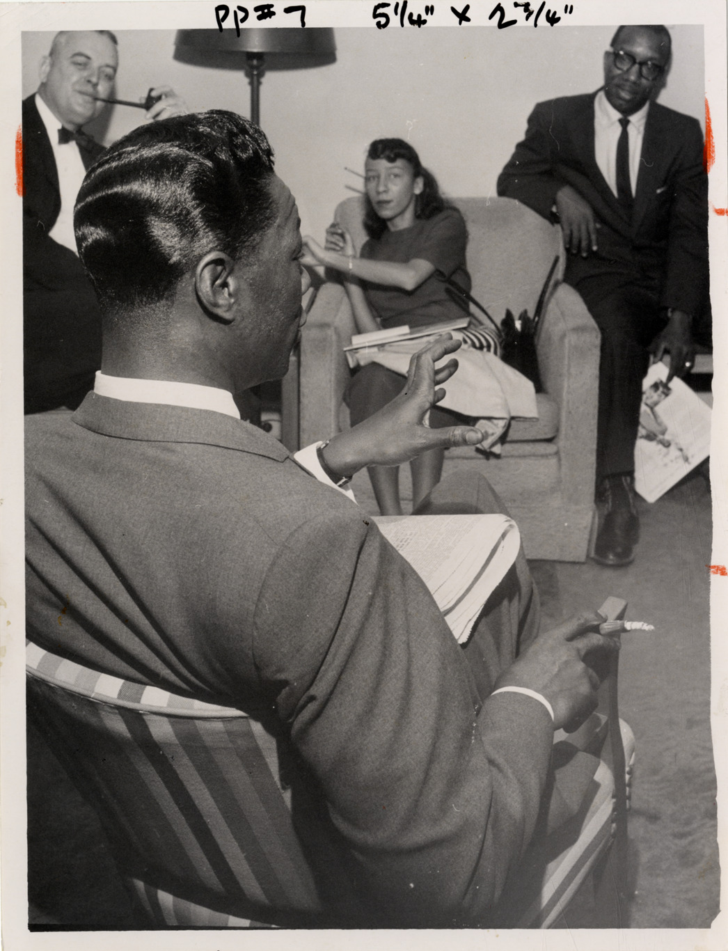 Favorite this☆ Nat King Cole Description: Rear view of singer Nat King Cole sitting in chair, holding a cigarette. Woman and two men in background. Details Resource ID: hk000534 Subject: Cole, Nat King, 1919-1965 African American singers Photographic prints Date Issued: Unknown year Format: 1 photographic print ; 9 x 7 in. Member of: E. Azalia Hackley Collection Filing Location: Biography--Cole, Nat King Rights: Physical rights are retained by DPL. Copyright is retained in accordance with U.S. copyright laws.