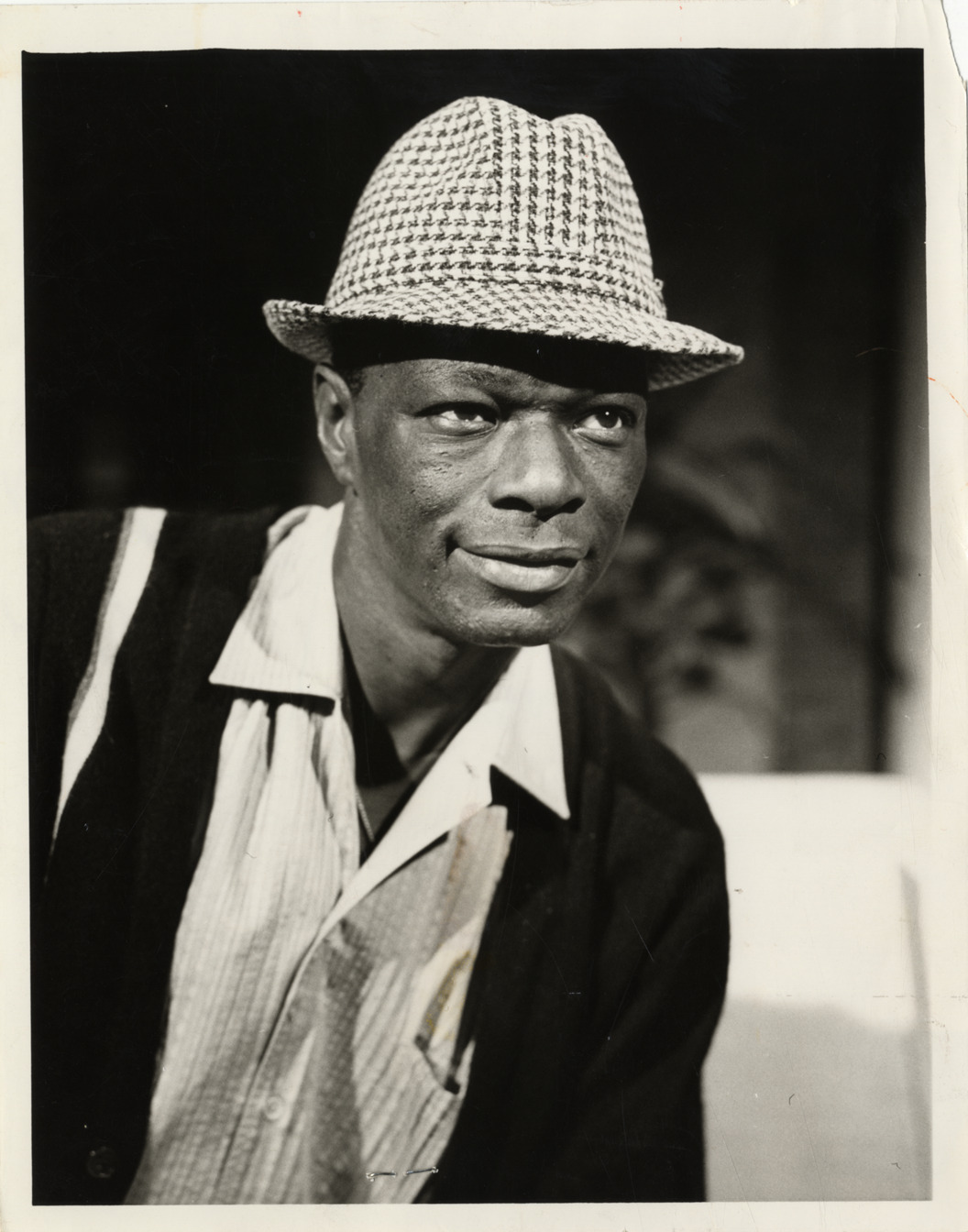View of singer Nat King Cole. Label on back: "NBC Color Television. Nat 'King' Cole will join Steve Allen in a piano duet when he guests on 'The Steve Allen Plymouth show' colorcast on NBC-TV Monday, March 7, 10:00 p.m., PST. Cyril Ritchard, Ann Richards and Charles Mann also will guest."