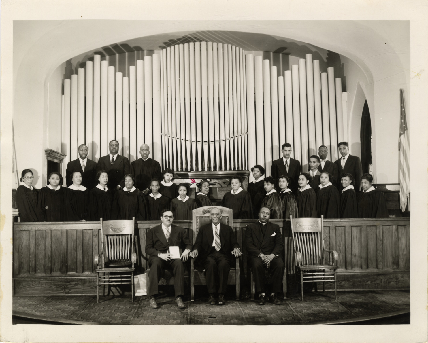 View of singer, pianist and choir director Sallie Green Collins (identified with an arrow) posing with the Christ Temple Senior Choir. Pipe organ in background. Handwritten on back: "Collins, Sallie Green, directress/pianist, Christ Temple Senior Choir (1954)."