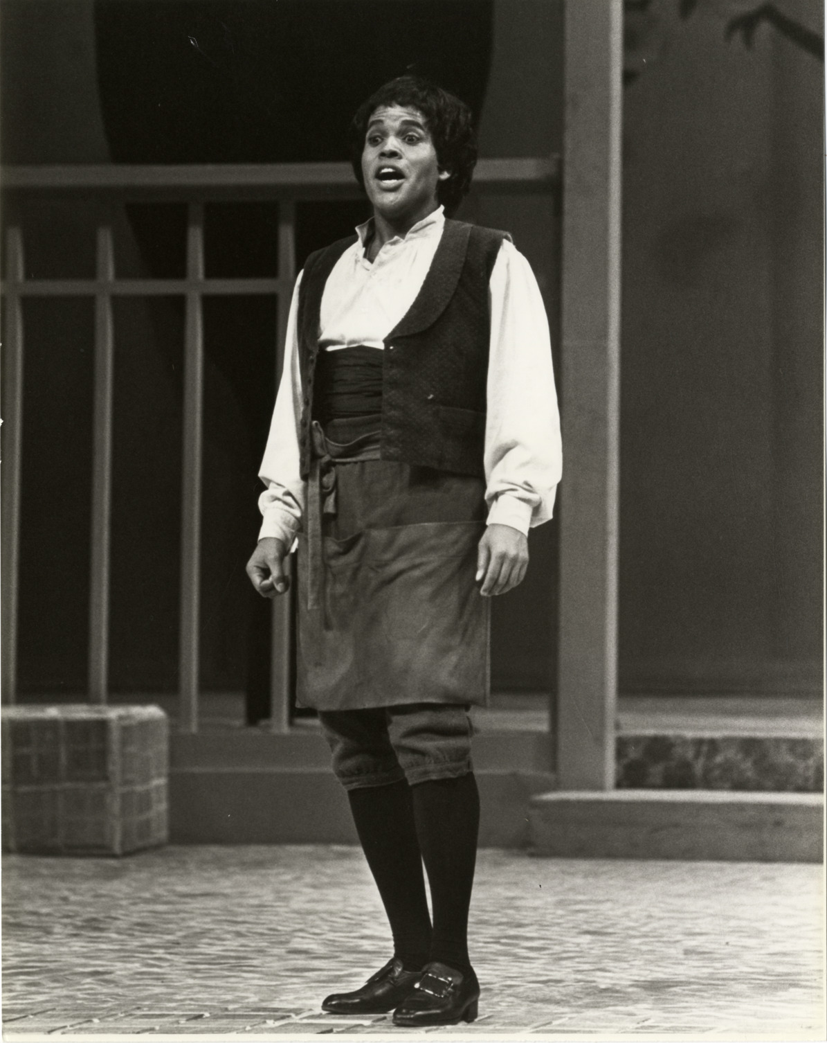 View of tenor Philip Creech in Mozart's opera, "The abduction from the seraglio." Label on back: "Press Department, Metropolitan Opera, Lincoln Center, New York City 10023. Philip Creech as Pedrillo in Mozart's "The Abduction from the seraglio."