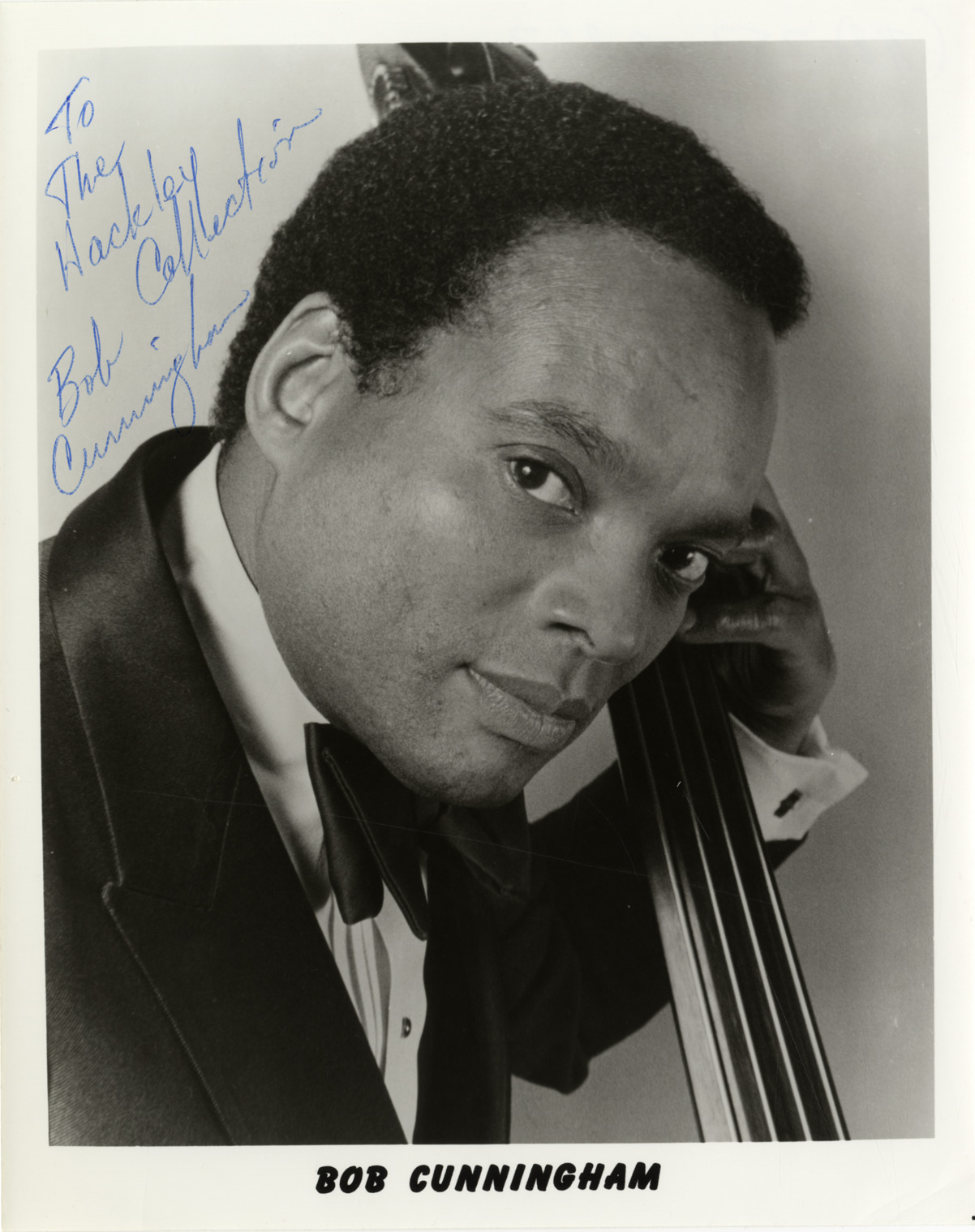 Favorite this☆ Bob Cunningham Description: View of musician Bob Cunningham posing with double bass. Autographed on front: "To the Hackley Collection, Bob Cunningham." Printed on front: "Bob Cunningham." Details Resource ID: hk000584 Subject: Cunningham, Bob, 1934- Cunningham, Bob, 1934- --Autographs African American musicians Double bassists Double bass Photographic prints Date Issued: Unknown year Format: 1 photographic print ; 10 x 8 in. Member of: E. Azalia Hackley Collection Filing Location: Biography--Cunningham, Bob Rights: Physical rights are retained by DPL. Copyright is retained in accordance with U.S. copyright laws.