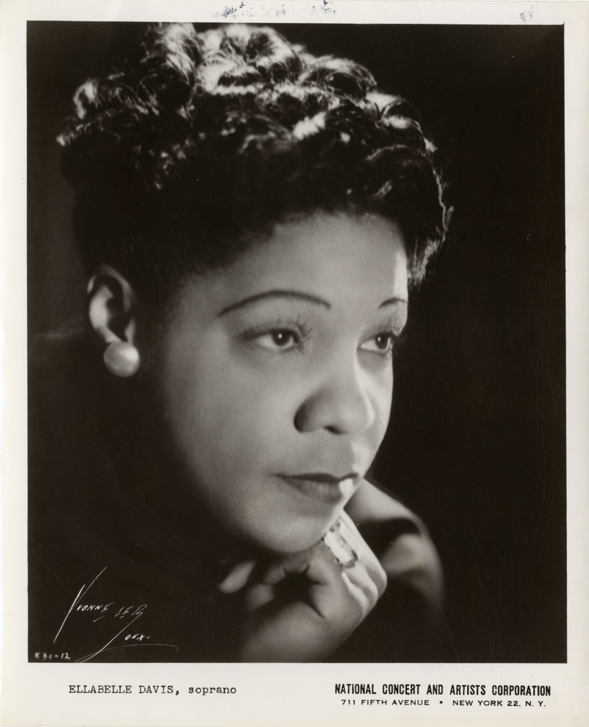 Portrait of soprano Ellabelle Davis. Printed on front: "Ellabelle Davis, soprano. National Concert and Artists Corporation, 711 Fifth Avenue, New York 22, N.Y. Yvonne LeRoux."
