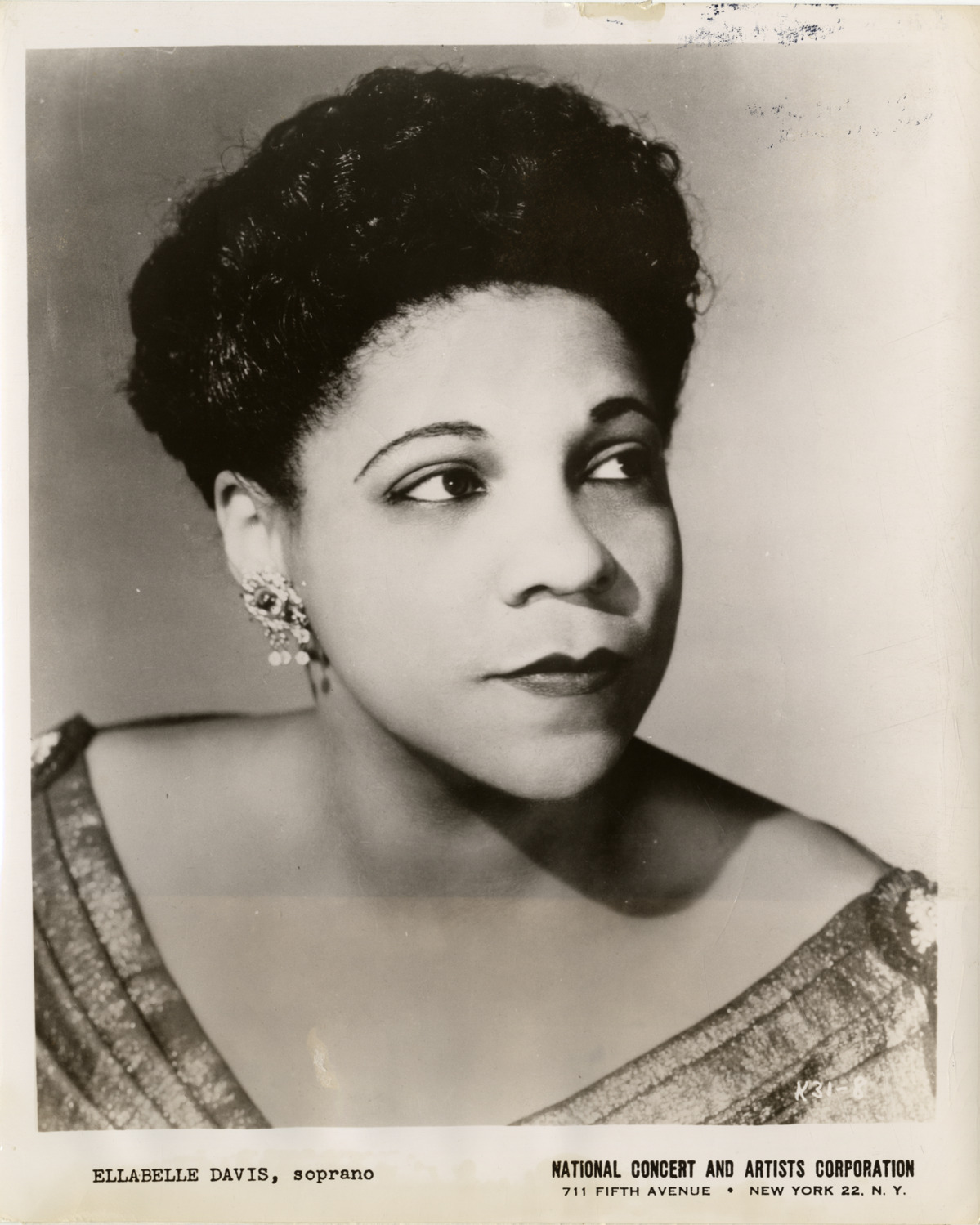 Portrait of soprano Ellabelle Davis. Printed on front: "Ellabelle Davis, soprano. National Concert and Artists Corporation, 711 Fifth Avenue, New York 22, N.Y." Label on back: "Voice of a century. Hailed by press and public of two continents as possessor of 'a voice of the rarest beauty that comes once in a century,' Ellabelle Davis, sensational American Negro soprano, will be heard by [blank] music lovers in concert at the [blank] on [blank]. Photo: Alfredo Valente."